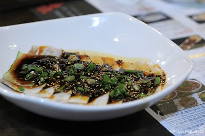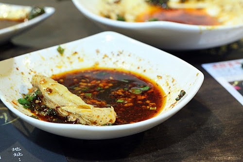 Thinly sliced pork covered in chili. I'm pretty good at eating spicy but I had to try my best to wipe off the chili but even then it was still spicy.