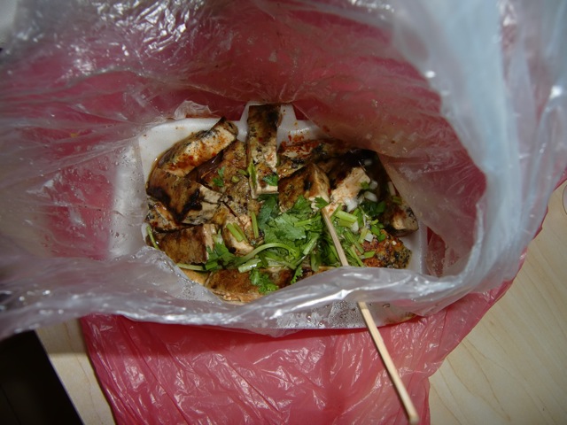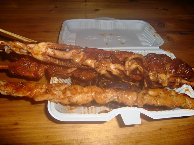 Sometimes when I'm hungry, I just go out on the street and pick out what kind of kabobs I want. I usually get a mix like this. There's squid, eggplant, beef, pork, and chicken in there. I especially have taken a liking to Chinese sausages. They have a sweet aftertaste to them.