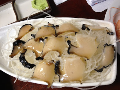 Our meal started with quail eggs, edamame, and an array of Korean condiments to accompany our appetizers. Next came soup and salad. The salad was like a cole slaw with a sweet vinaigrette sauce. It also had roe and halibut and tossed inside as well. The star of the show of course is the freshly caught halibut. It is served on an ice platter. The sashimi tastes extremely fresh. We also wrapped the halibut in the lettuce leaves provided. Accompanying the halibut platter were eight additional dishes. The raw abalone was a bit chewy. The naengmyeon aka cold noodle was one of my faveorites. It had salmon, halibut, fruits, and cabbage all mixed in with a kick of spice!