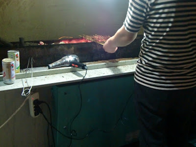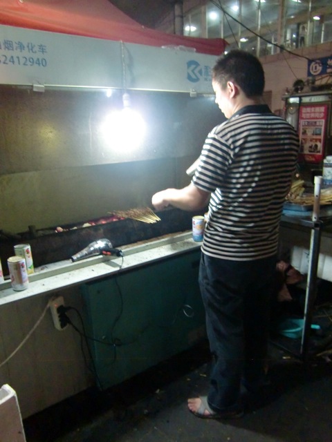 Here's a close up. Yes, he's using a hair dryer to help dry his kabobs? Awesome. 2 lamb kabobs please! 1RMB each! Yum and fresh!