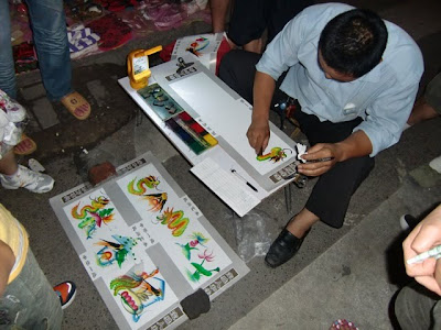 On my way to the little haven of street food in Wudaokou, I saw this guy making some awesome calligraphy paintings. Here's the guy starting on my Chinese name. I've had this done in the past, but this guy was way better.