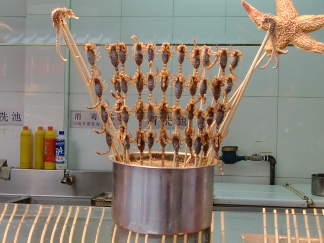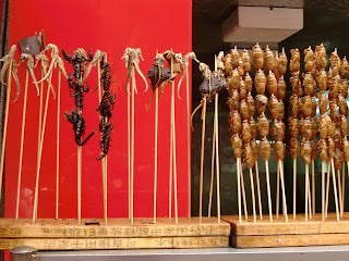 Because I saw these "kabobs" hanging around. The sad part was t hat those scorpion-like things were actually still alive while pierced through the stick. You choose your stick and then the worker marinates them in some seasoning before roasting them to a crispy "delight".