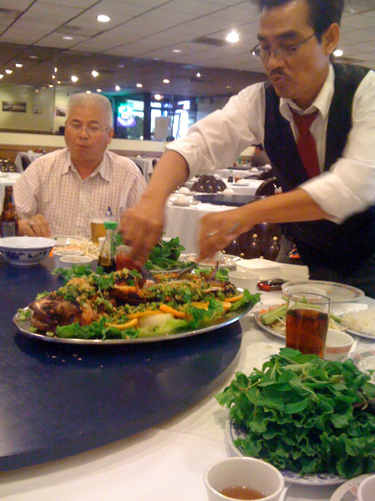 Here's the waiter cutting up our catfish. This catfish had onions and a bunch of other yummy seasonings stuffed in it, unlike the catfish at the new Phong Dinh. So so good!