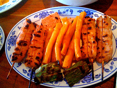 Left is a picture of their pork grilled meatball wraps. Think spring roll but WAY better! Right is their Charbroiled pork patties wrapped w/ banana leaves. Double yum!