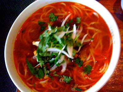This is Bun bo Hue. It's a popular soup noodle dish that is made with beef, oxtail, pig's knuckles, or pork and also has cubes of pig blood inside. Like all asian things, it sounds gross but tastes delicious!