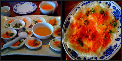 Left is Bahn beo- is basically a steamed rice cake and it's topped with mung bean paste, shrimp, scallions, and fried shallots. You dip it in fish sauce. The right is bahn hoi which is made of rice vermicelli. It's also dipped in fish sauce.