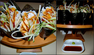 I was so excited! They had an assortment of vegetarian hand rolls! Remember Gourmet Vegetarian-the vegetarian place I went to in L.A. where I said they had amazing vegetarian hand rolls? (See here) Well this place's hand rolls knocked theirs outta the park! This was their "abalone" hand roll. So good!!!